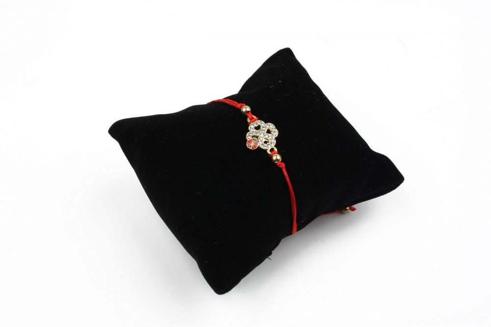 • Bratara este formata din snur textil rosu reglabil cu charm auriu trifoi si gargarita. Dimensiune charm de aprox. 12mm.
