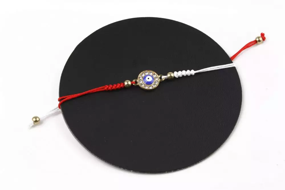 • Bratara martisor este formata din snur textil alb-rosu reglabil cu charm evil eye si strasuri albe.