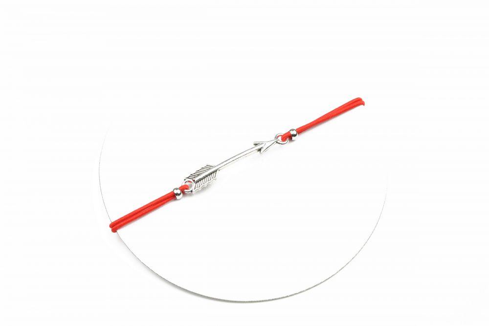 Bratara este formata din snur elastic rosu cu charm argintiu sageata. Dimensiune charm de aprox. 35mm.