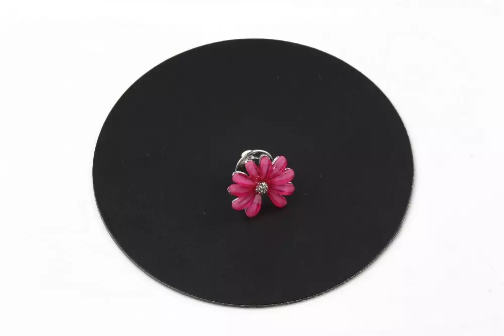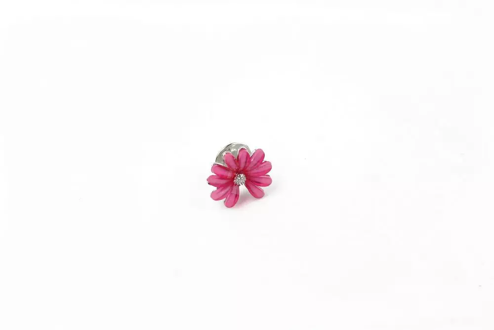 • Brosa floare acrilica roz pe baza metalica argintie realizata din metale comune cu inchizatoare pin. Dimensiuni: 2cm latime si lungime.