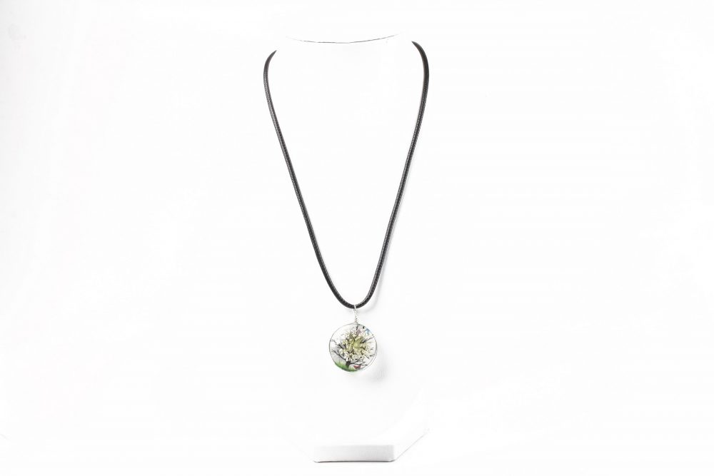 • Colierul este format din snur cerat negru grosime 2mm si pandantiv cabochon sticla model copacul vietii. Ambele fete au modele si pot fi usor diferite de la un produs la altul.