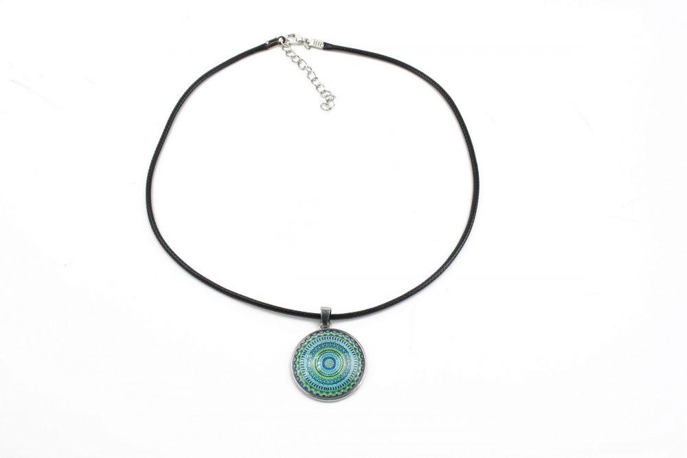 • Colierul este formst din snur cerat negru grosime 2mm si pandantiv cabochon pe baza metalica argintie cu model mandala.