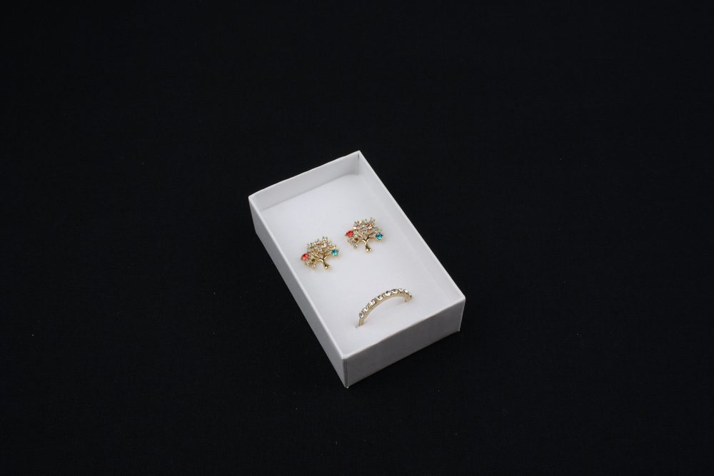 • Cutie cadou alba pentru set (cercei, colier si inel) cu inaltimea de 2,5cm, latimea de 5cm si lungimea de 8cm.