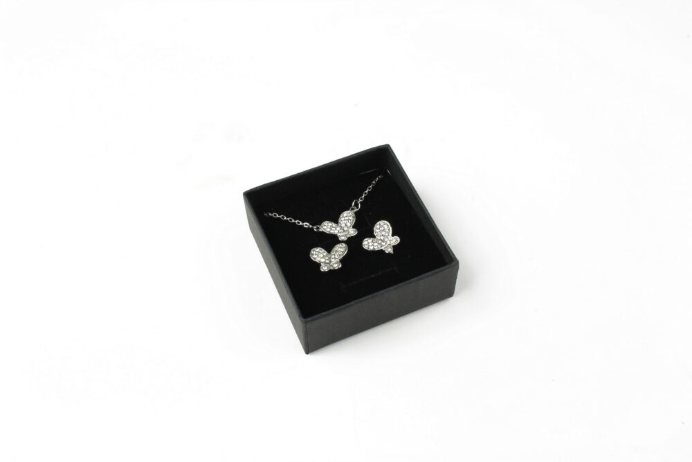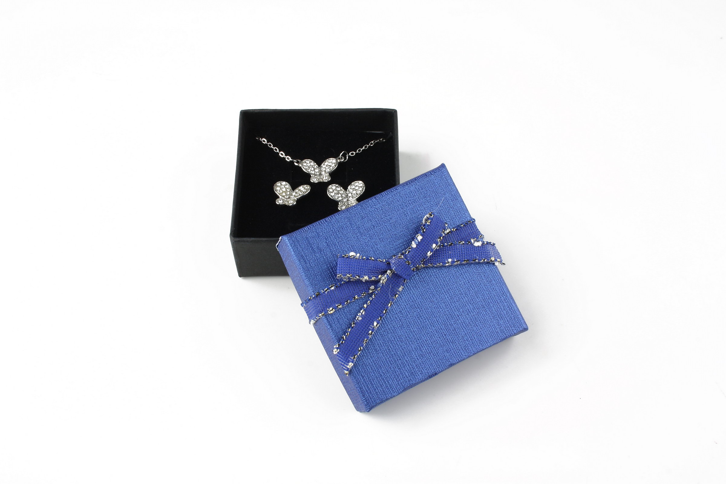 • Cutie cadou albastra pentru set (cercei, colier si inel) cu inaltimea de 2,5cm, latimea si lungimea de 5,5cm.