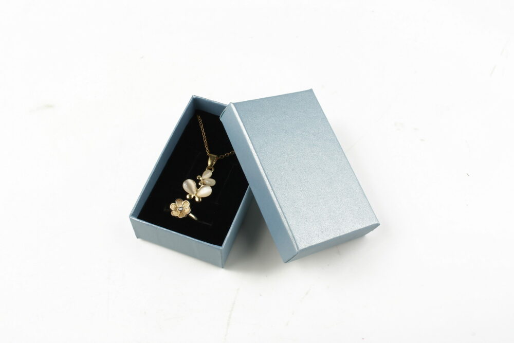 Fabricată din carton durabil și rezistent, cutia are un design modern și delicat, cu o nuanță bleu ce inspiră finețe și rafinament. Interiorul moale și compartimentat protejează bijuteriile împotriva zgârieturilor, menținându-le perfect așezate și evidențiind frumusețea fiecărui detaliu.