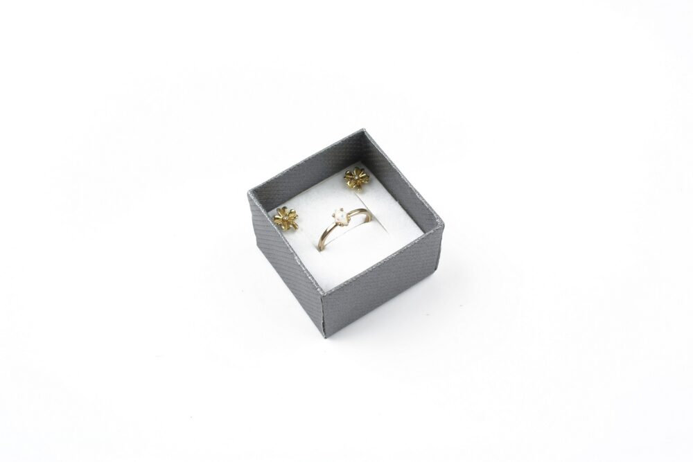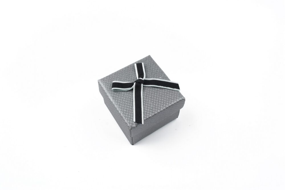 Cutie cadou gri pentru inel sau cercei cu inaltimea de 3,5cm, latimea si lungimea de 4,5cm.