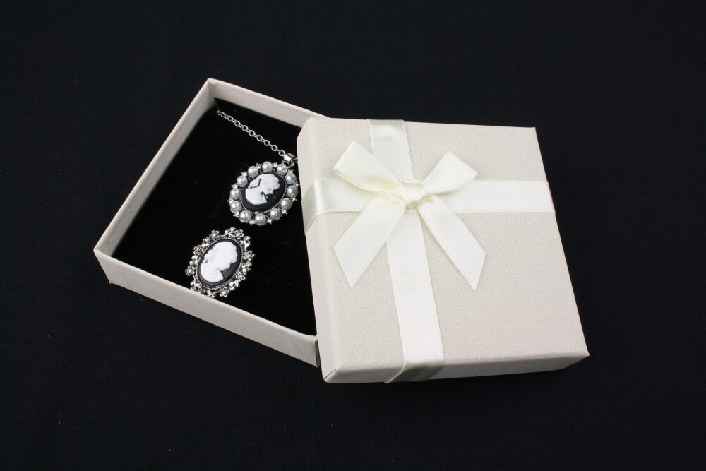 Adaugă o notă de eleganță fiecărui cadou cu această cutie de cadou ivory din carton premium, special concepută pentru ambalarea și prezentarea bijuteriilor. Ideală pentru cercei, coliere și inele, cutia oferă un aspect rafinat și profesional, perfect pentru cadouri, magazine de bijuterii sau prezentări de produse handmade.