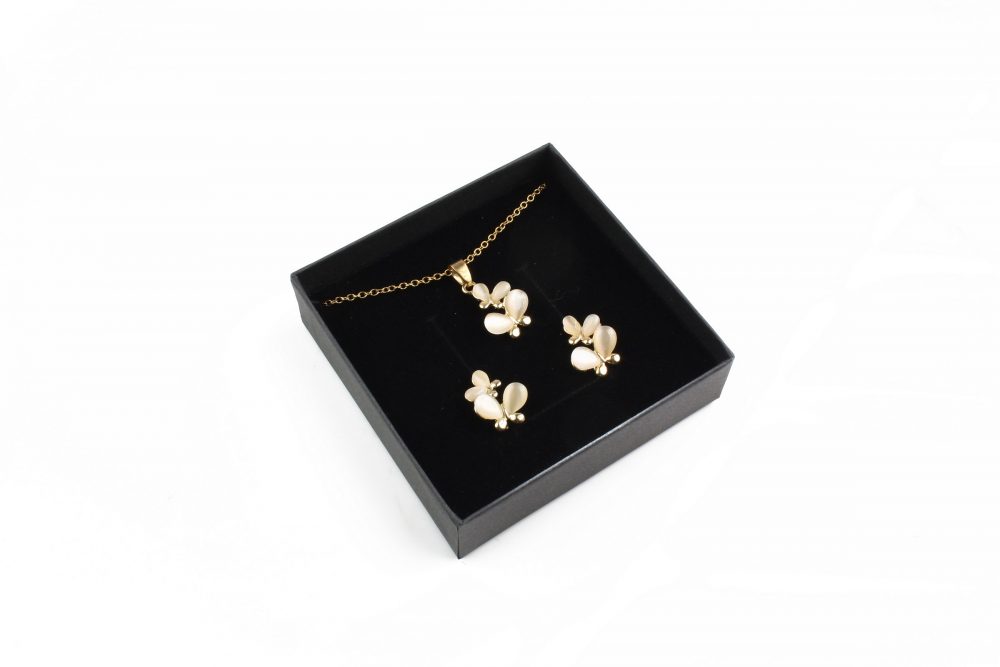 • Cutie cadou neagra pentru set (cercei, colier si inel) cu inaltimea de 2,5cm, latimea si lungimea de 8,5cm.