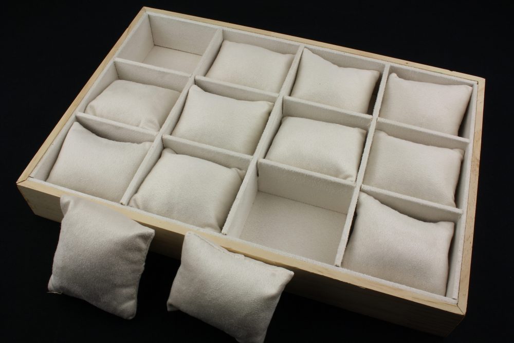 Panoul are 12 casute si 12 pernute pentru prezentare bratari sau ceasuri, este din bambus imbracat in panza natur, iar dimnesiunile sunt lungimea de 35cm si latimea de 24cm.