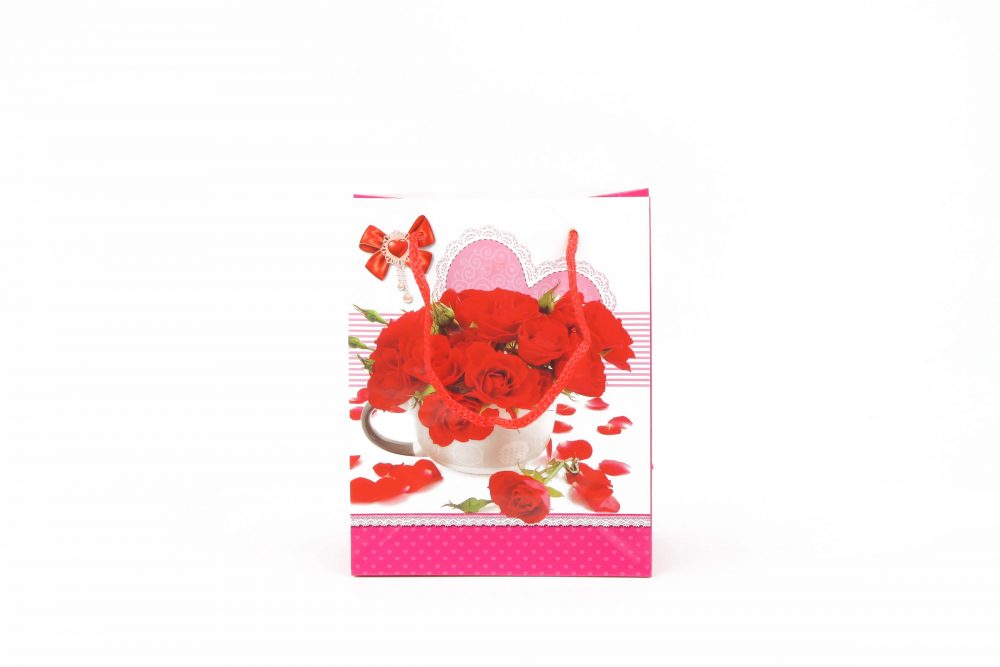 Punga cadou model floral este realizata din hartie lucioasa si are manere din snur.