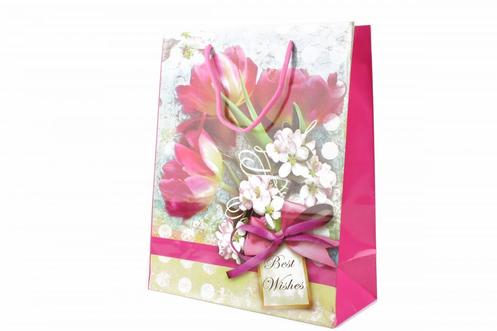 Punga cadou model floral este realizata din hartie lucioasa si are manere din snur. Dimensiunile sunt: inaltime de 31cm, latime de 26cm si latime burduf de 11cm.