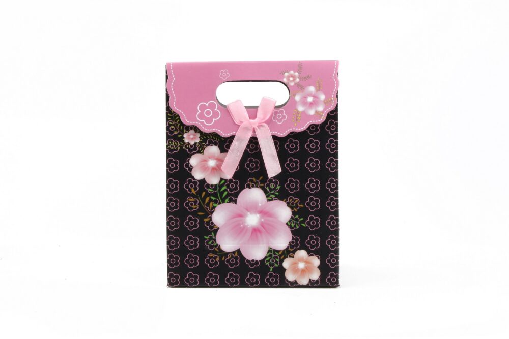 Punga cadou neagra model floral cu latimea de 12,5cm si lungimea de 16cm. Pretul afisat este pentru un singur produs.
