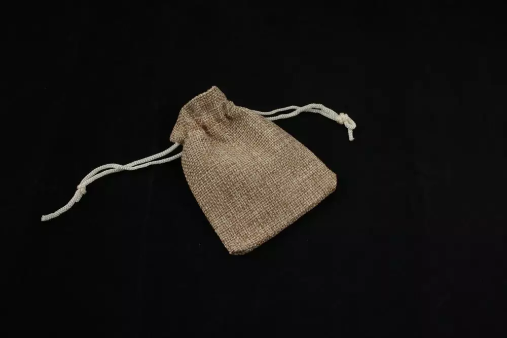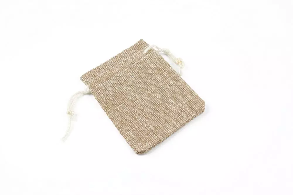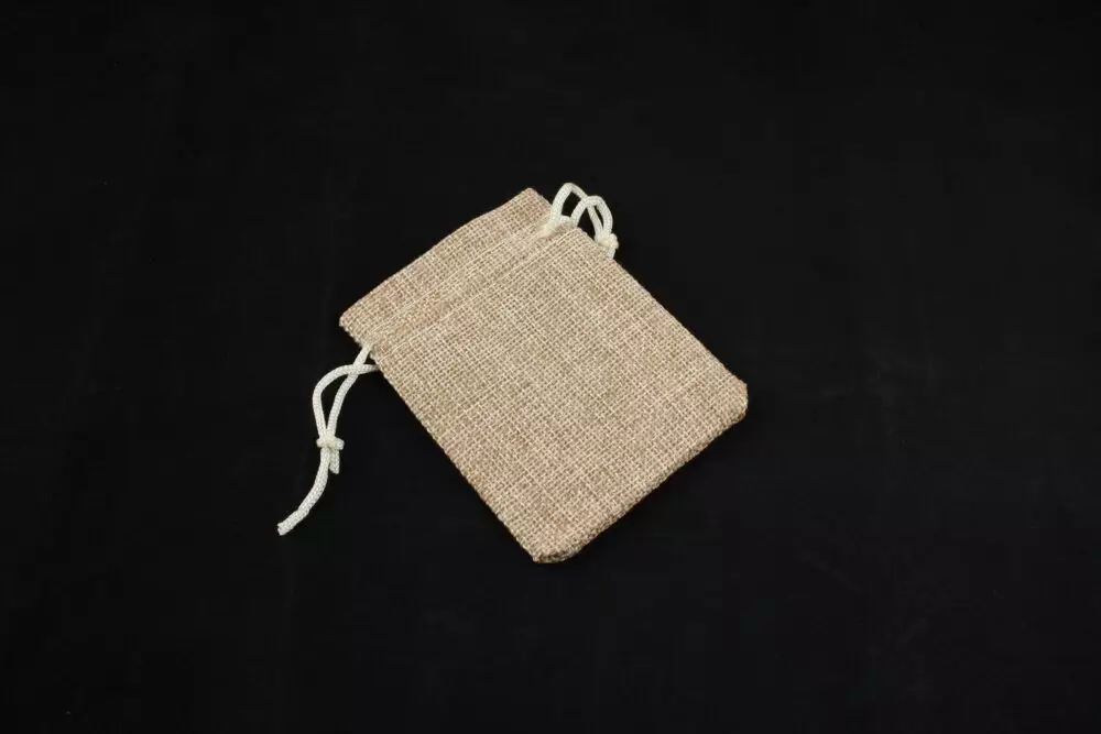 Saculet din panza de sac maro deschiscu latimea de 6,5cm si lungimea de 9cm.