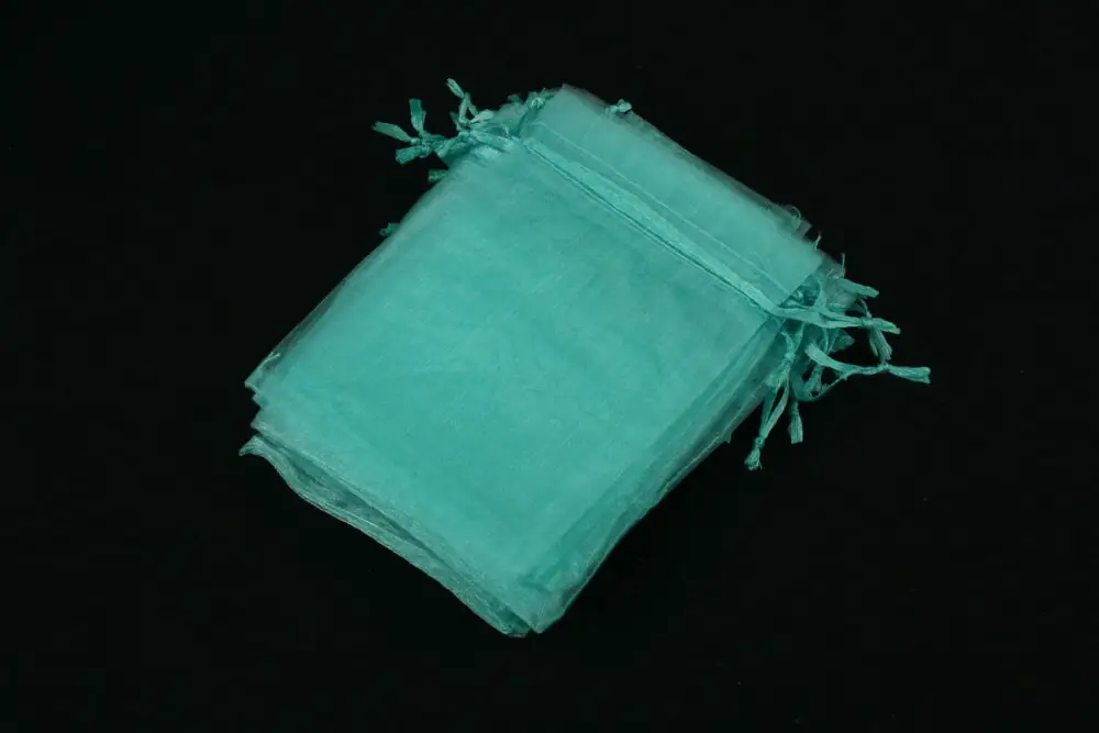 Saculet organza turcoaz cu latimea de 8,5cm si lungimea totala de 11,5cm.