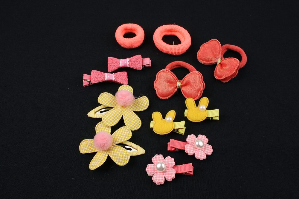 • Setul contine agrafe de par, elastice si clame multicolore din materiale textile pe baze metalice.