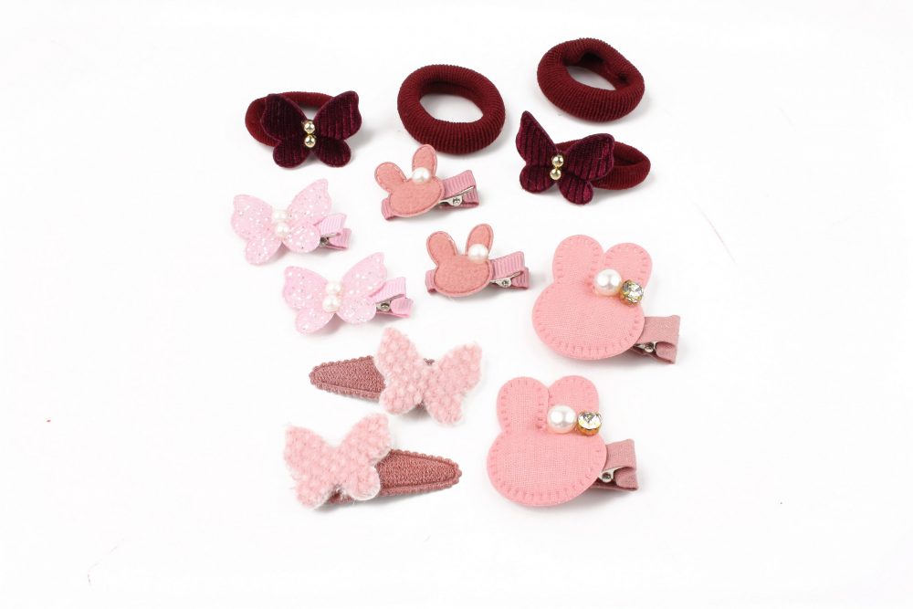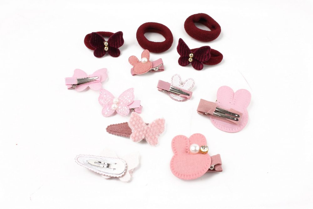 • Setul contine agrafe de par, elastice si clame multicolore din materiale textile pe baze metalice.