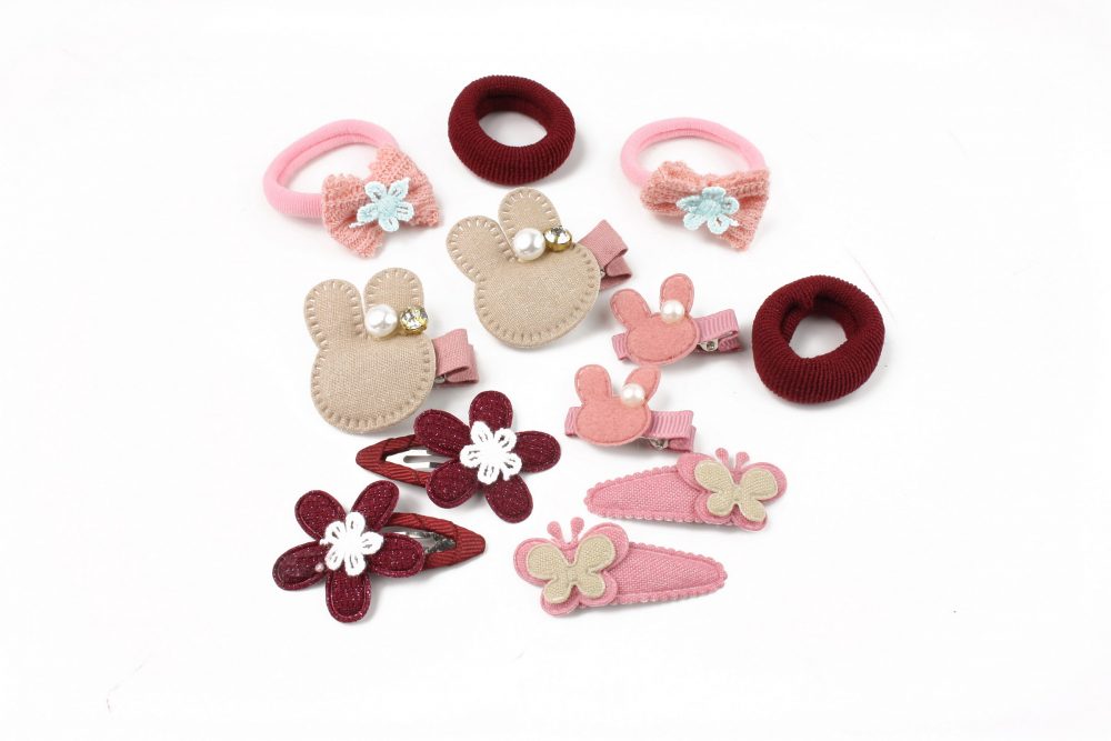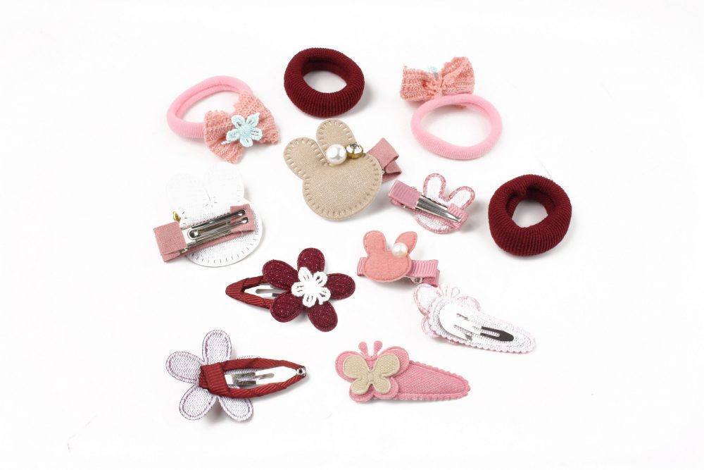 • Setul contine agrafe de par, elastice si clame multicolore din materiale textile pe baze metalice.