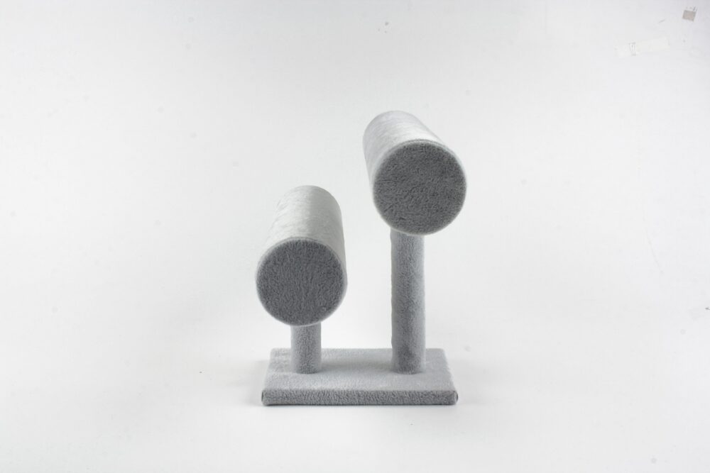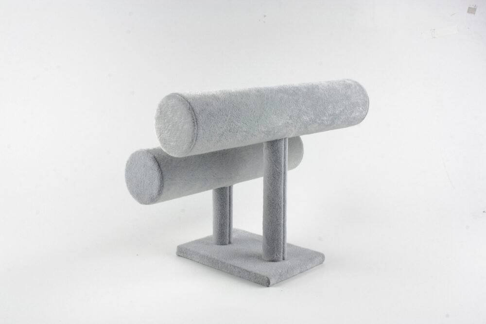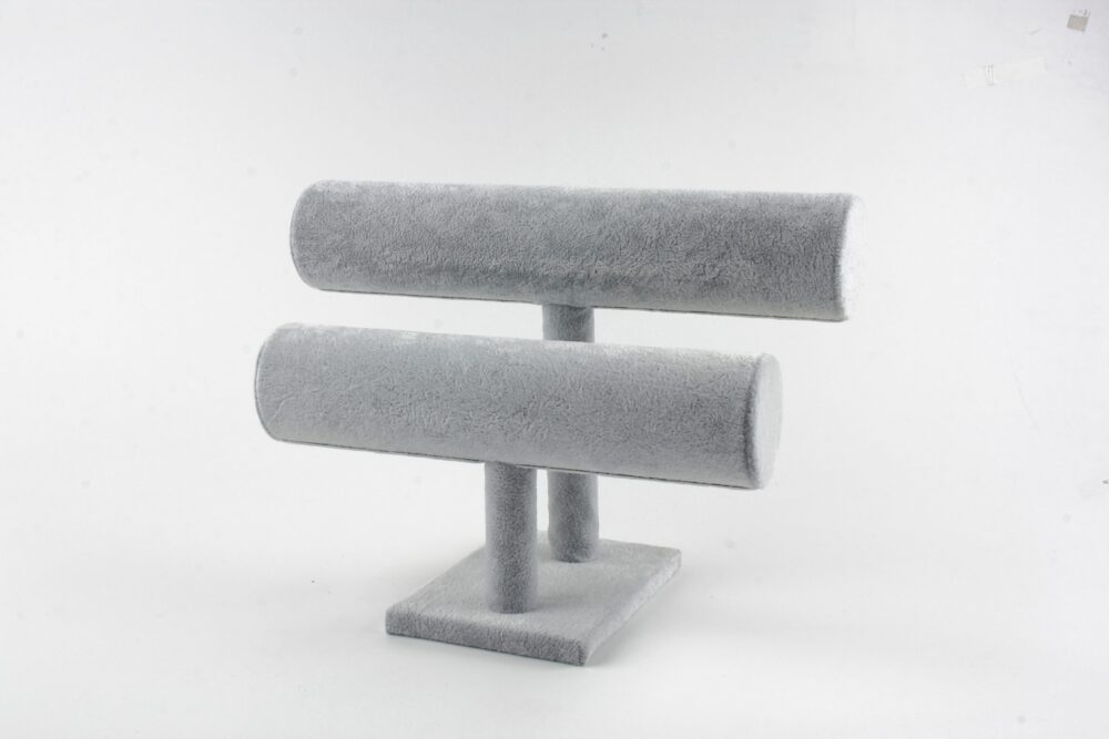 Suport catifea gri pentru prezentare bratari sau ceasuri cu 2 brate cu inaltimea de 17cm, lungime cilindru superior de 26cm, lungime cilindru inferior de 21cm si diametru cilindru de 5cm.Pretul afisat pentru un singur produs.
