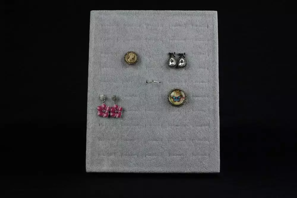 Suportul este prevazut cu 50 orificii pentru inele sau cercei si este din catifea gri.