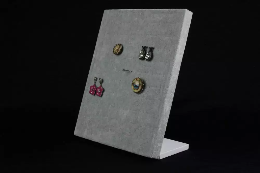 Suport gri pentru prezentare inele sau cercei tip rama cu inaltimea de 24cm si latimea de 20cm.